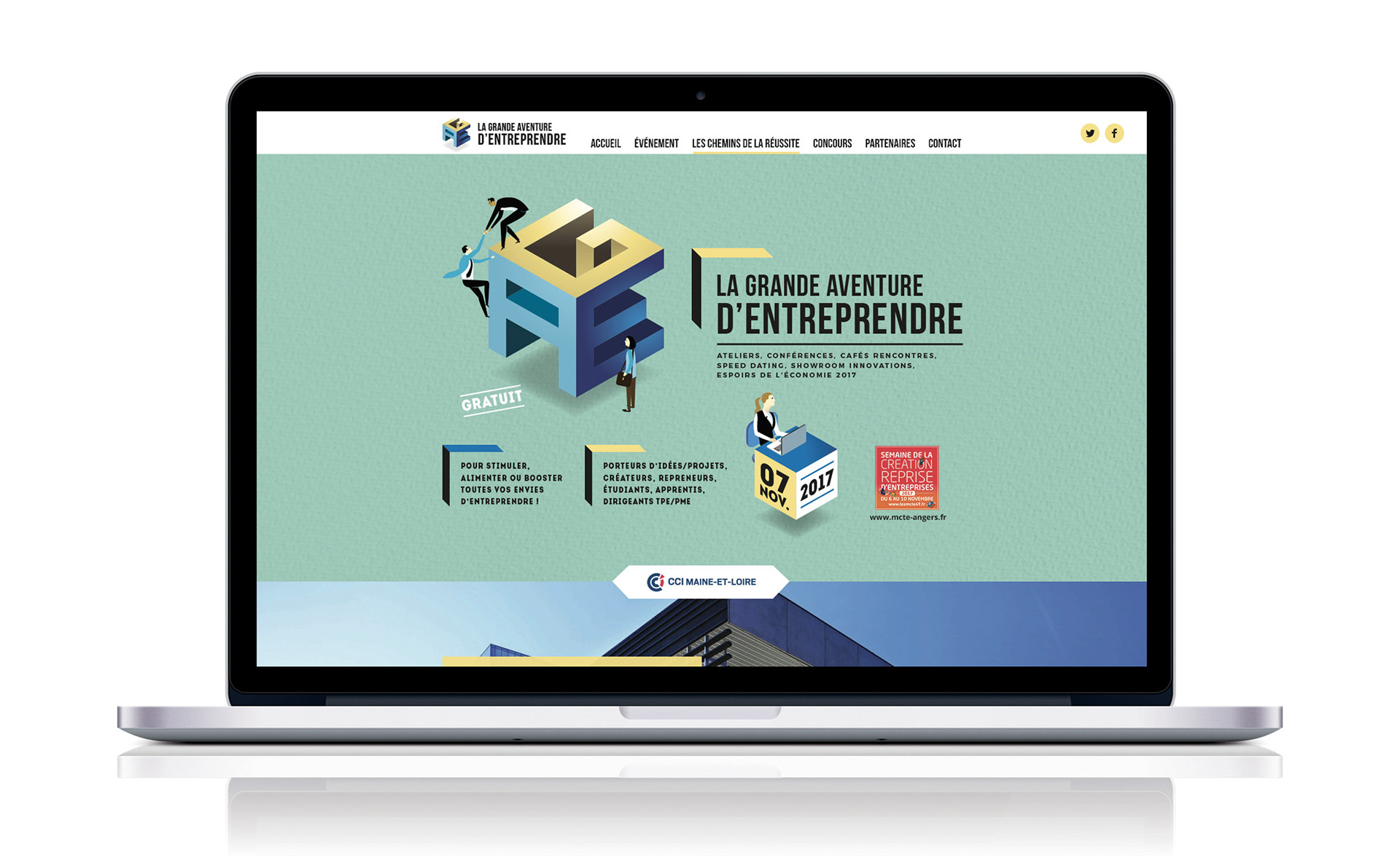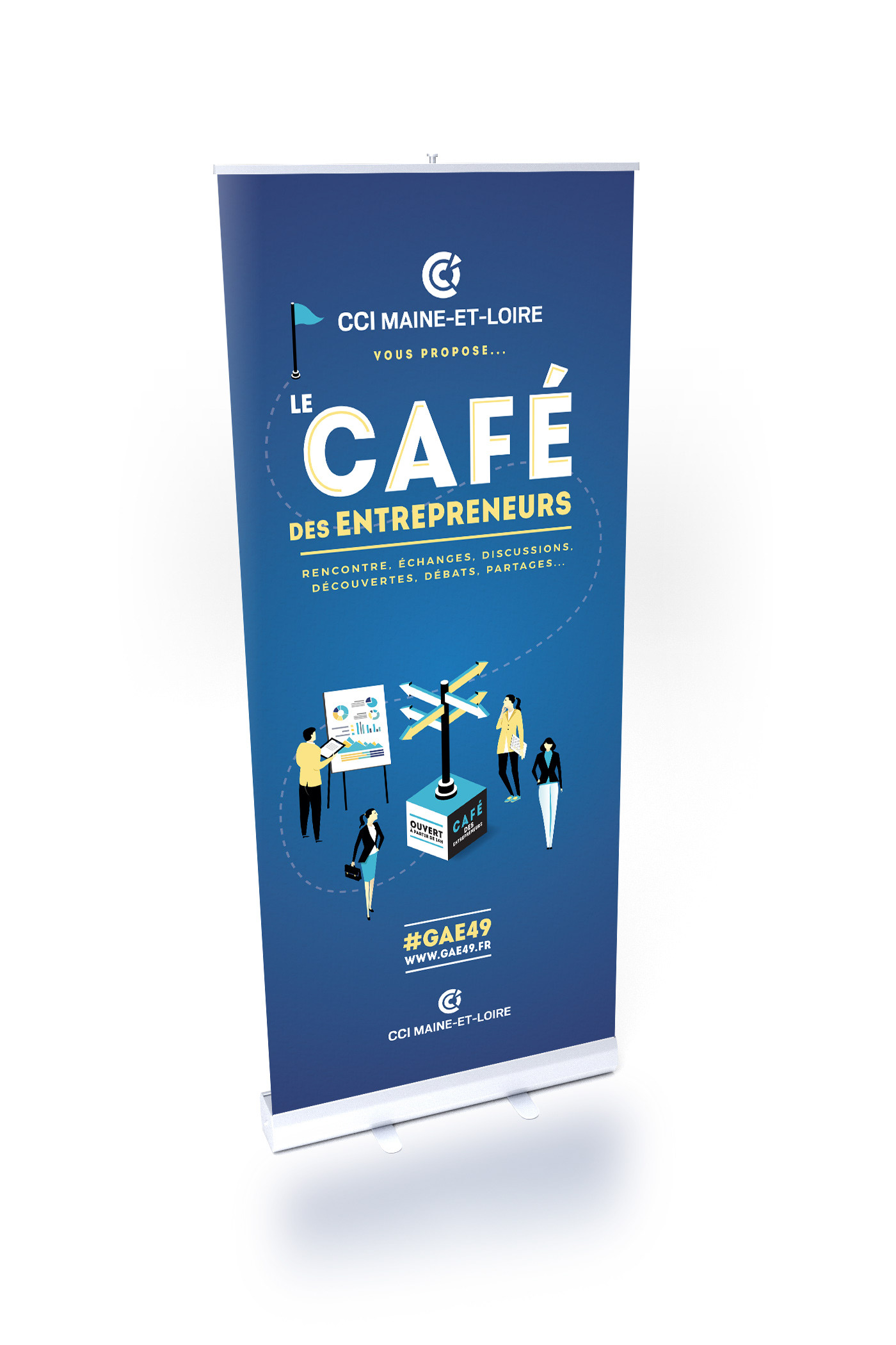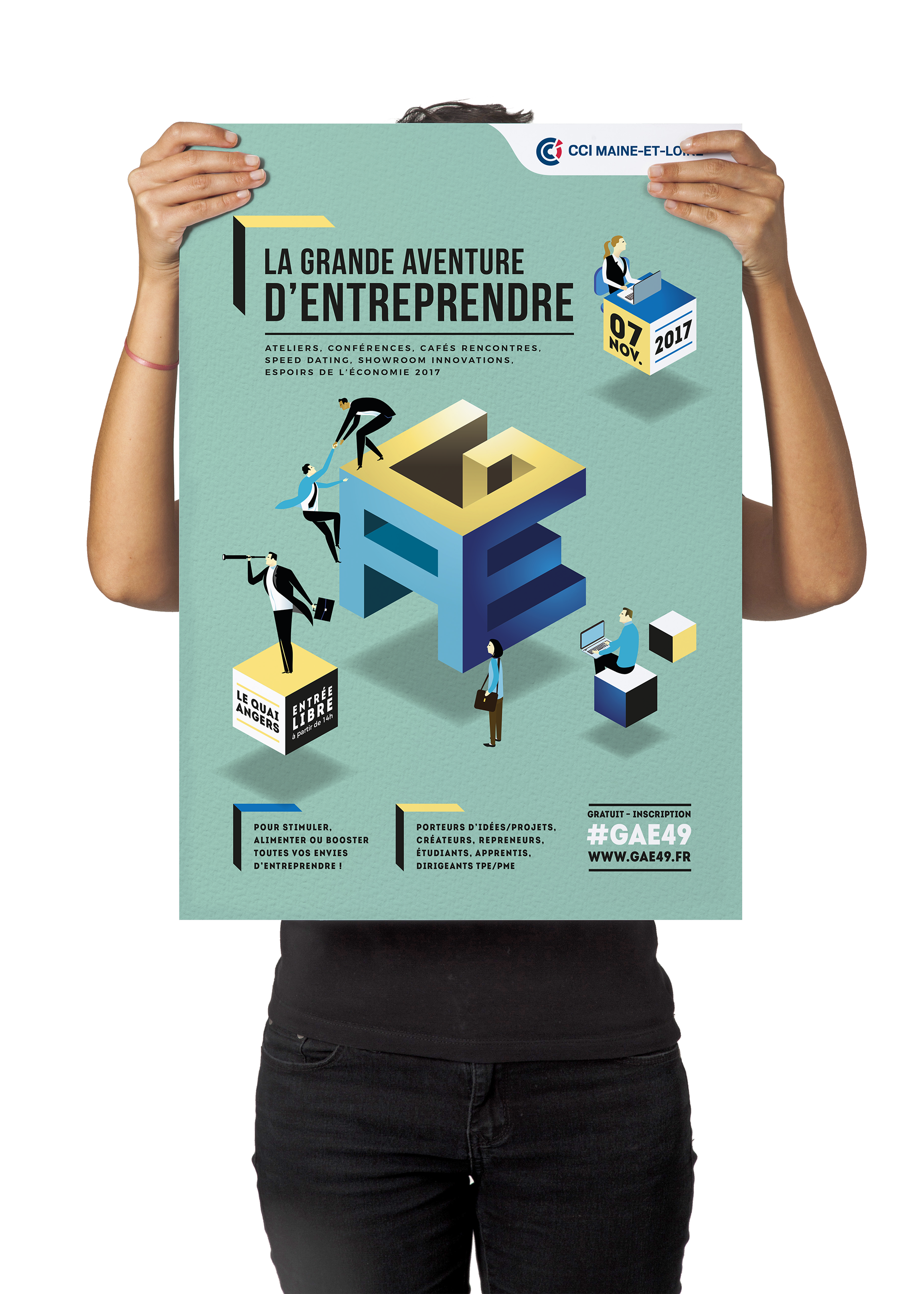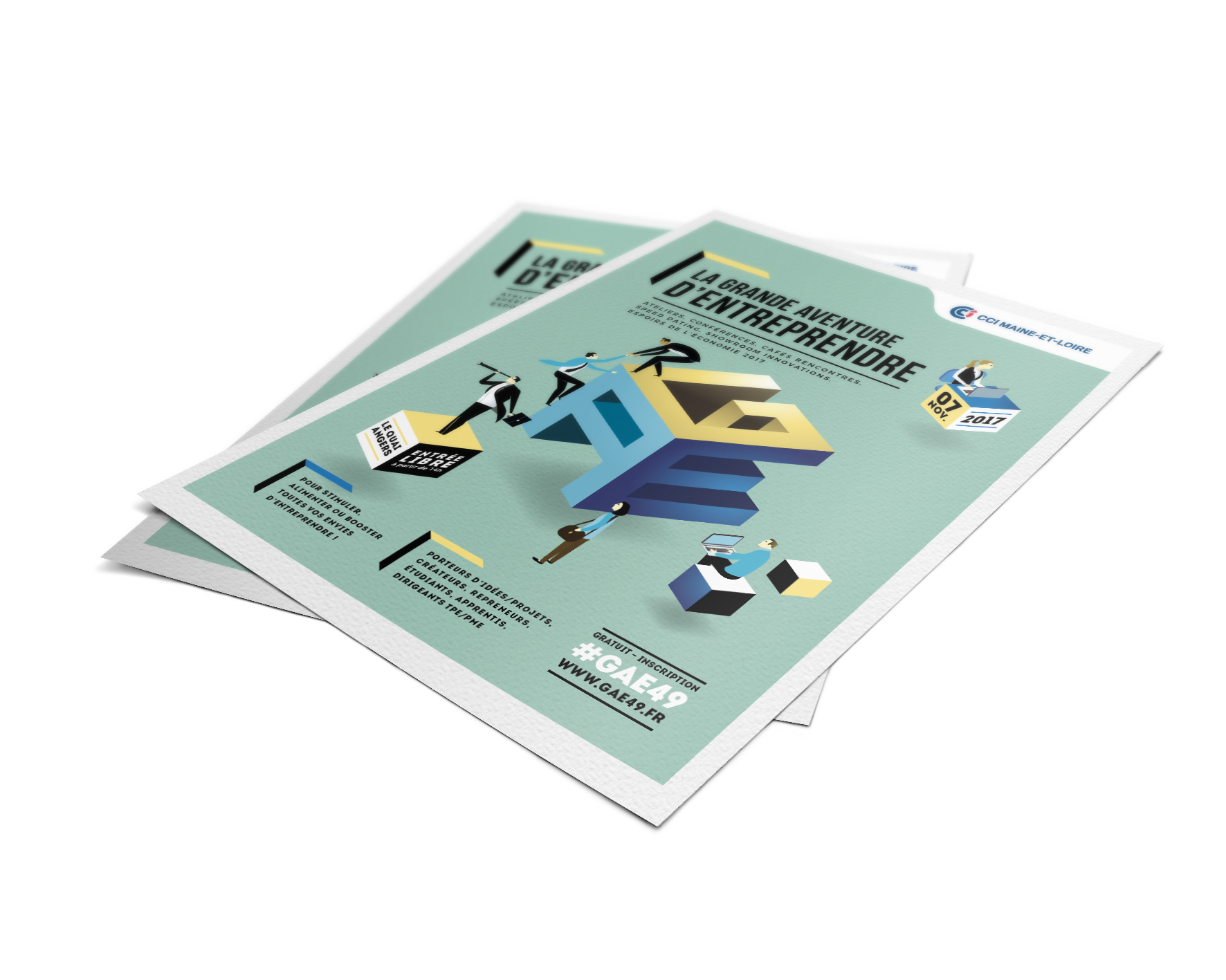 Organisée par la CCI de Maine-et-Loire, la Grande Aventure d’Entreprendre est une journée dédiée à la promotion de l’entrepreneuriat et de l’initiative. Dans le cadre de sa campagne de communication, j’ai conçu une partie des supports visuels sur plusieurs éditions, dont celle de 2017 présentée ci-dessous.