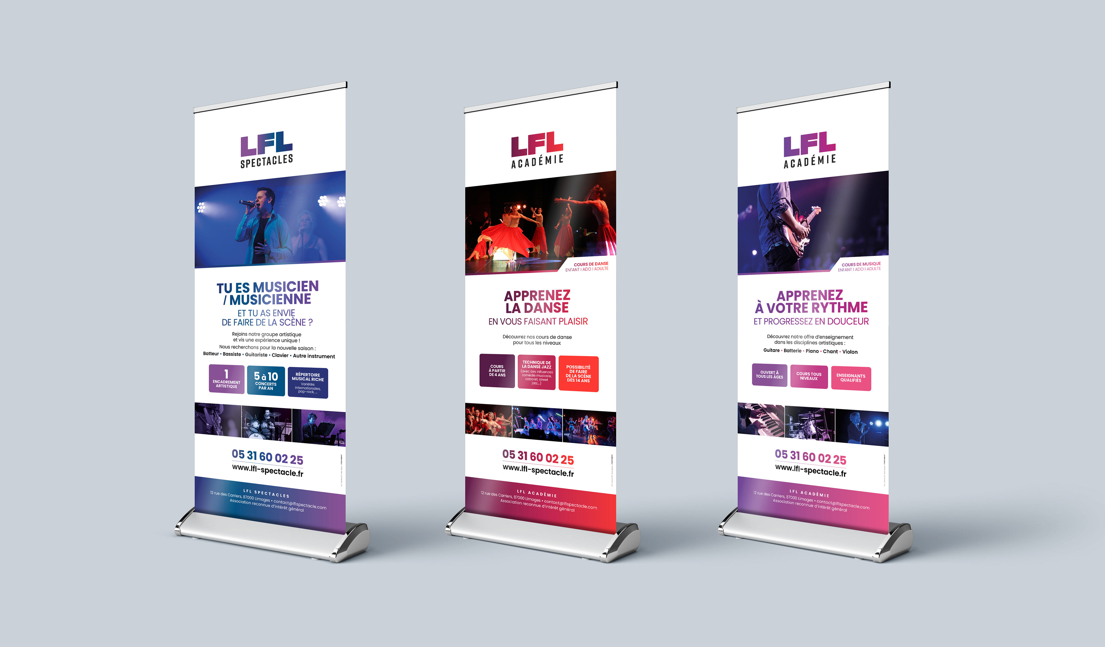 J’ai assuré la création et la conception de l’ensemble des supports de communication de LFL, association musicale de Limoges dédiée à la formation des jeunes et à la création de spectacles vivants. Plaquette, tabloïd annuel, kakémonos, mailings et outils promotionnels ont permis de renforcer la cohérence visuelle de l’association et d’accroître la visibilité de ses actions culturelles, pédagogiques et artistiques.
